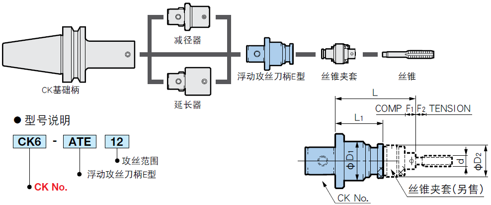 需要長型攻絲刀柄時,與加長型的CK基礎柄 結(jié)合,配置自如。