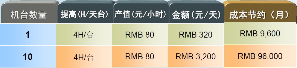 10臺設(shè)備一年理論上所提高的產(chǎn)值96,000*12= RMB 1,152,000