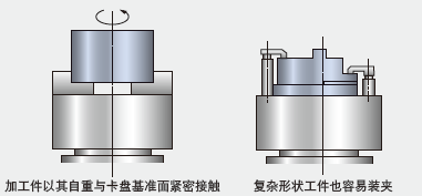 ●由於加工件以其自重與卡盤基準面緊密接觸,所以從薄型工件到大直徑,重型工件,都可以進行高精度穩(wěn)定的加工。