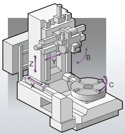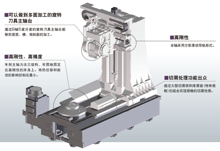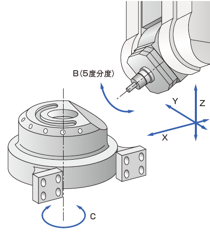 車削加工及豎、橫之外可以進行傾斜面(B軸5度分度)的加工。