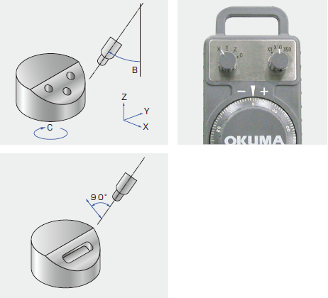在傾斜刀具主軸的狀態(tài)下,在軸方向以及軸上沿直角的方向可以進行手輪進給。利用該功能通過脈沖手輪可以簡單地進行在傾斜面上開孔,退刀,傾斜面的平面加工。