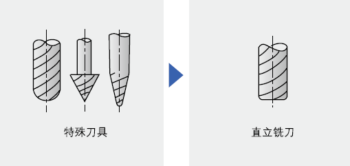 與球頭銑刀的點(diǎn)接觸切削相比較 , 通過在直立部分上的側(cè)刀 切削 , 可大幅度縮短加工時間。同時 , 高剛性短刀具的使用, 可避開干擾的角度進(jìn)行切削。