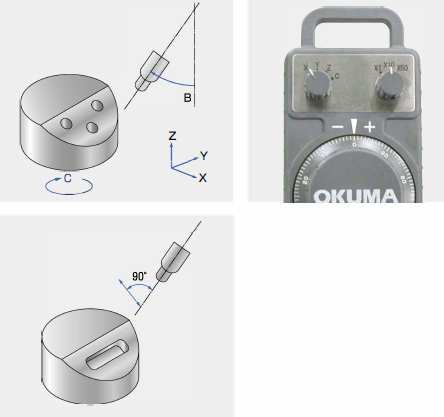 在傾斜刀具主軸的狀態(tài)下, 在軸方向以及軸上沿直角的方向可以進(jìn)行手輪進(jìn)給。 利用該功能通過脈沖手輪可以簡單地進(jìn)行在傾斜面上開孔, 退刀或傾斜面的平面加工。