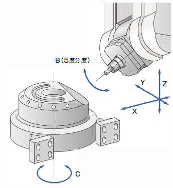 本機(jī)為5軸控制(同時控制4軸), 可以做到一次夾緊多面加工。 為此 , 可有利于大幅度縮短更換工序所需時間, 避免安裝誤差 , 提高加工精度。