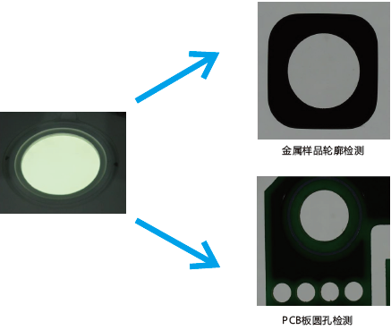 底光源可突出樣品的輪廓信息,可檢測(cè)樣品輪廓邊緣的毛發(fā),凹陷等缺陷檢測(cè);用于電子元件、IC的引腳、端子連接器檢測(cè),透明物體劃痕檢測(cè)等。